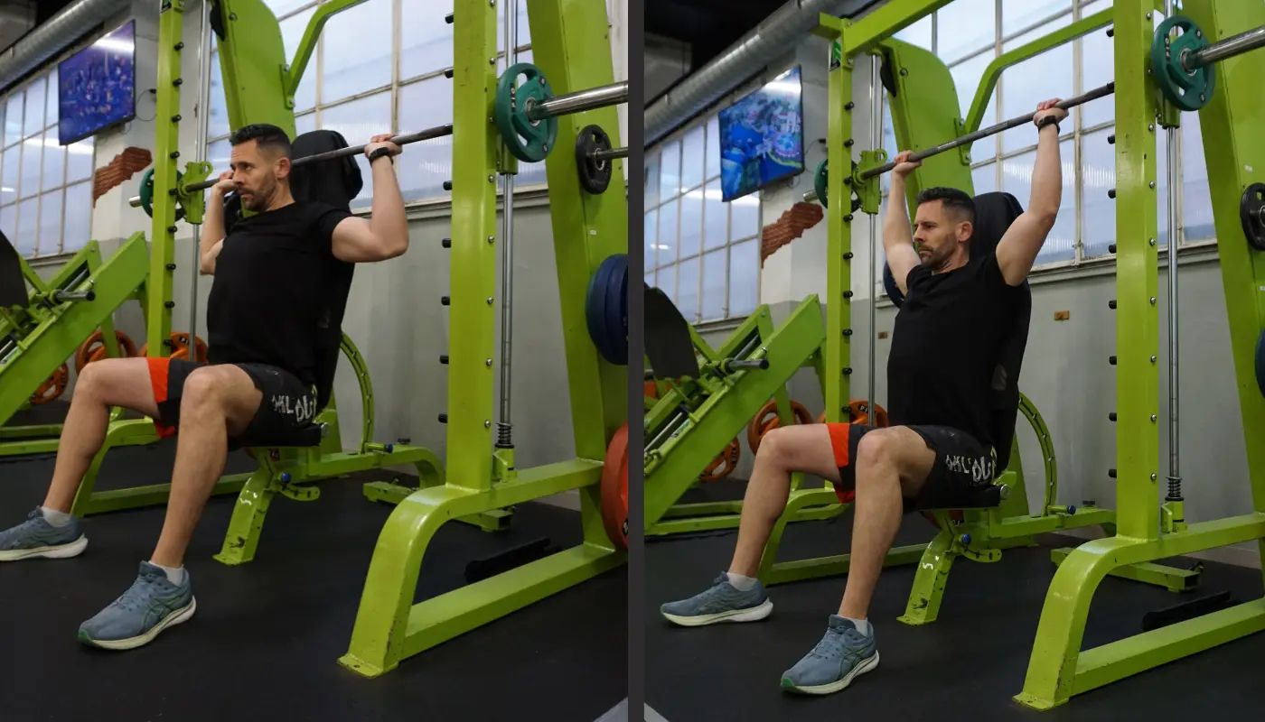 Desde esta posición, presiona la barra hacia arriba hasta que tus brazos estén completamente extendidos. Mantén la espalda recta y el core firme para estabilizar el cuerpo durante el movimiento.